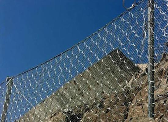 被动防护网采用锚杆、钢柱、支撑绳和拉锚绳等固定方式将金属柔性网以一定的角度安装在坡面上,形成栅栏形式的栏石网,从而实现对落石和泥石流体中固体物质拦截的一种防护网。由钢丝绳网或环形网(需拦截小块落石时附加一层钢丝格栅)、固定系统(锚杆、拉锚绳、基座和支撑绳)、减压环和钢柱四个主要部分构成,前者为起特征构成。起防护能量一般为150KJ~2000KJ,特殊设防能高达5000KJ。被动系统根据起防护能量、结构形式和特征构成的不同分为三类17种型号。